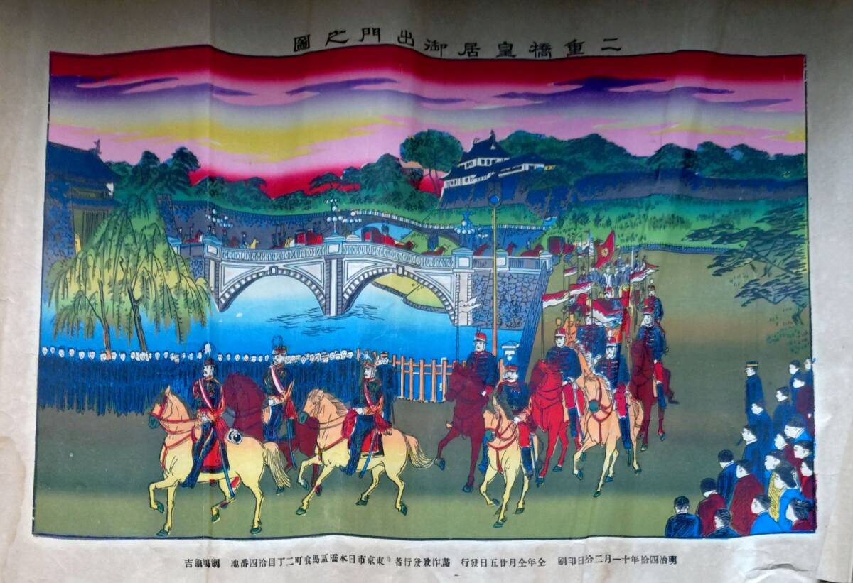 - f24110853〇一枚摺物 刷物 彩色石版画 二重橋皇居御出門の図 明治39年〇和本古書古文書