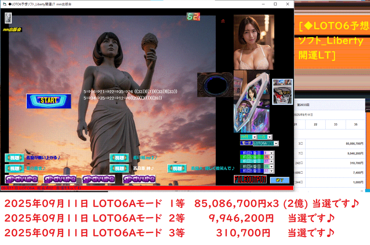 秋の新作 [◆LOTO6予想ソフト_Liberty開運LT] ロト予想ソフトをご案内申し上げます。 最強ソフトのロト6 フォーメーション予想版シリーズがまた登場! インストラクターのさつきちゃんが高額当選を予感!!!他ソフトでも、この「さつきちゃん」コラボは、ご案内後に1等高額当選が出ていることでも、有名になっています。2025年09月11日 LOTO6Aモード 1等 85,086,700円x3 (2億) 当選です♪2025年09月11日 LOTO6Aモード 2等 9,946,200円 当選です♪2025年09月11日 LOTO6Aモード 3等 310,700円 当選です♪もしや、さつきちゃんって、超ラッキーメーカーですか?予想中に新曲「百日草_絆」や「青龍よ優しく微笑んで」が流れると超激熱です!!!「ラッキートリガー」発動で、3000万円以上当選の87%期待度になります。 このスペックは、ロト予想界史上で歴史的にも最強仕様の名機となります。今主流の「先ばれ告知音」が鳴れば、更に高額当選濃厚! Liberty開運パワー振りは、実績と仕様が示す通りです。特にロト6のインストラクターのアイドル?!さつきちゃんが「神回」を予告・・・この日は激熱!!2025年09月11日 LOTO6Aモード 1等 85,086,700円x3 (2億) 当選です♪2025年09月11日 LOTO6Aモード 2等 9,946,200円 当選です♪2025年09月11日 LOTO6Aモード 3等 310,700円 当選です♪ 2025年09月11日 LOTO6Aモード 1等 85,086,700円x3 (2億) 当選です♪2025年09月11日 LOTO6Aモード 2等 9,946,200円 当選です♪2025年09月11日 LOTO6Aモード 3等 310,700円 当選です♪ [◆LOTO6予想ソフト_Liberty開運LT]09月11日 LOTO6A 総合点62 自信をもってね[◆LOTO6予想ソフト_Liberty開運LT][5⇒16⇒21⇒22⇒35⇒26 ((33))((7))((33))((33))][◆LOTO6予想ソフト_Liberty開運LT][5⇒34⇒35⇒22⇒12⇒6((2))((37))((38))][◆LOTO6予想ソフト_Liberty開運LT]さつき「今日は凄く当たるLibertyな気がするわ♪」今回は、新機能、業界開発の機能を2つ搭載しています!二つ目が、「ラッキートリガー」です。3000万円以上当選の90%期待度になります。あなた様も、今日からでも、一つロトで楽しみを持つのも、どうですか。もうすでに人生が楽しく変わっています。今回は、特典グラビア さつきちゃんの画像が観れる機能が付いています もーさつきちゃんに、身も心もまかせちゃってください。このツールは、診断チェック機能を装備した、予想ソフトです。 1.買いたいロト券が、本当に信頼できるのか、ガチで勝負しても、大丈夫なのか? 2.買い目を数点に絞りたいが、有望な勝負できる数字を、知っておきたい。 3.ロト6で買いたいが、1、2点で勝負に適した買い目を知りたい。 要は、このソフト 一点一点の買い目の診断と、勝負になる絞った予想の買い目も出してくれます。 診断した買い目の総合の評価点数や、どんな勝負度合いが良いかの指示も出ます。実際に、どんな当て方を過去にこの予想ツールがしてきたのかを、ご説明いたします。こんなシンプルなツールで、こんなに高配当などが立て続けに当たるのですから、楽です。[[◆LOTO6予想ソフト_Liberty開運LTの具体的仕様な説明]]・このソフトは、パソコンWindows版の全てに対応しています。Xp Vista 7 8 8.1 10 11動作確認済み ・買い目は、全てのロト6基本 (予想にもボーナス数字を含むため)、LOTO6 3点~7点 です。・条件により、倍の数の買い目が出ることが御座います。基本点数とは異なる数の予想数になることがあります。・熱い予告の時に、さつきちゃん、★GOGO★ランプも点灯します。・新機能、業界開発の「先ばれ告知音」機能を搭載しています!・新機能、業界開発の「ラッキートリガー」発動で3000万円以上当選の87%期待度になります。・予想中に新曲「百日草_絆」や「青龍よ優しく微笑んで」が流れると超激熱です!!!・さつきちゃんが、本来持つあなたの強運を引き出そうと暖かい励ましでメッセージを言ってくれます。・特典グラビア さつきちゃんの画像が観れる機能が付いています 【演出別期待度】 さつき☆ さつき実写☆☆ レインボー☆☆☆ ・買い目の一つ一つについて診断が出来る予想ツールです。・診断だけでなく、LOTO6の勝負の度合いも指南してくれます。・予想ソフトは、過去の当選数字が閲覧、参照などができれば、だれでも簡単に予想できます。・画面を見ての通り、入力箇所も3、4箇所程度で、マウスによる選択形式です。シンプルで簡単です。今だけ、特別にご奉仕価格にて、ご提供致します。 是非お薦めです♪[◆LOTO6予想ソフト_Liberty開運LT] ロト予想ソフト価格16,298,000円→価格5000円