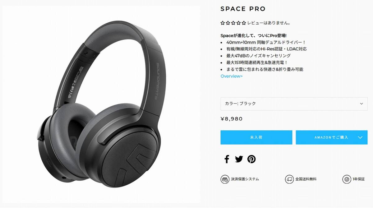 > 【新品】SOUNDPEATS Space Pro ワイヤレスヘッドホン 有線対応 LDAC ハイレゾ対応 密閉型ヘッドホン 50mmユニット Type-C Bluetooth v5.4