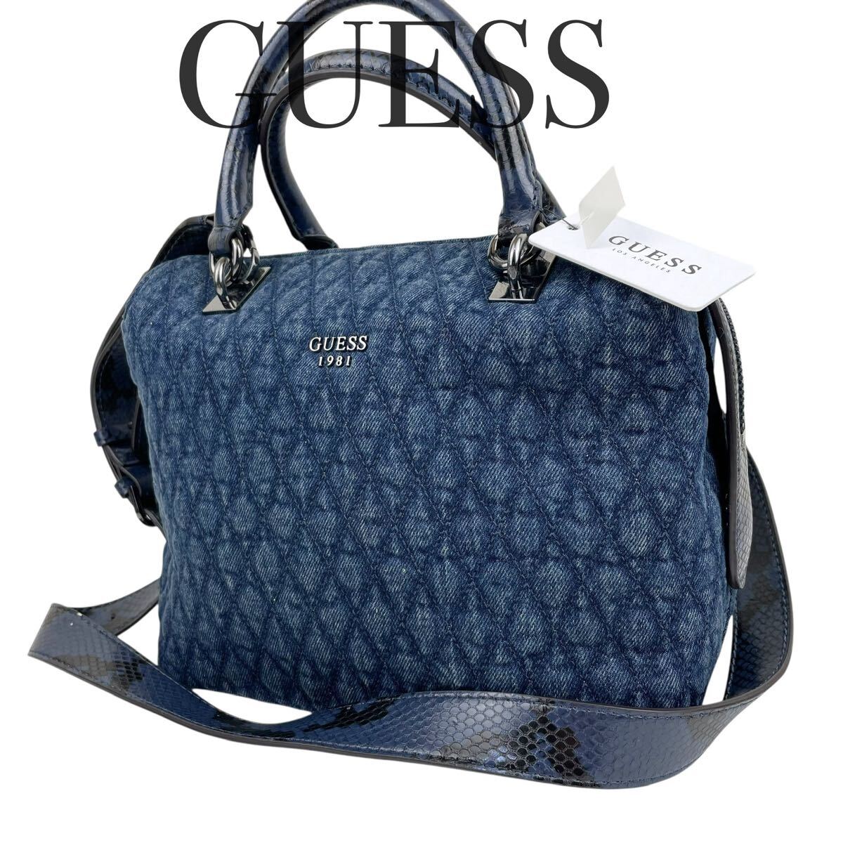 - 未使用に近い GUESS ゲス ハンドバッグ 2way デニム パイソン ブルー 青 トートバッグ ショルダーバッグ 斜め掛け