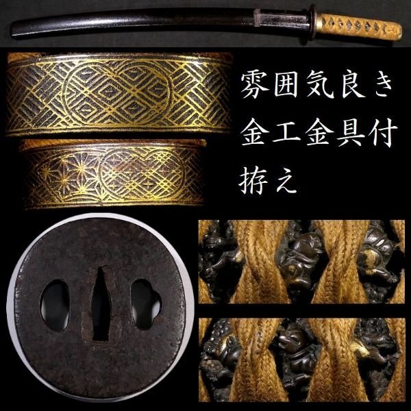 > 【 恵 k0064 】 雰囲気良き金工金具付拵え 目貫:「後藤系統 二疋犬 優品」 縁頭:金象嵌 鍔:刀匠 厚み約5mm 良く鍛えられた鉄地 丸形