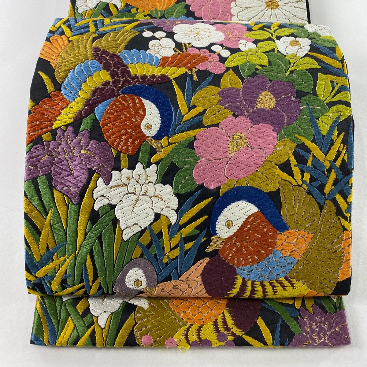 - 袋帯 逸品 河合美術織物 落款 京西陣織 鴛鴦 草花 唐織 箔 黒 六通 正絹 【中古】