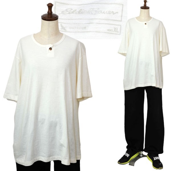 > ★【国内正規品 近年モデル】 Eddie Bauer エディーバウアー コットン100% ヘンリーネック 無地 オーバーサイズ Tシャツ XL アイボリー系