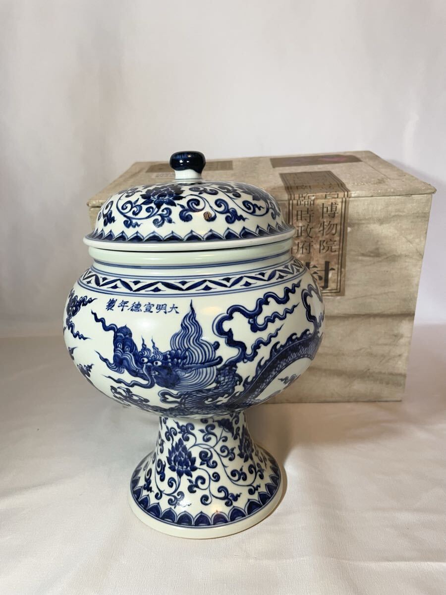 > 【故宮】染付 龍鳳纏枝紋高脚缶 約H27-W20cm民国政府故宮博物院 明宣徳年製 中華民国南京臨時政府封 故宮博物院西安 押運部隊七十二軍 古玩