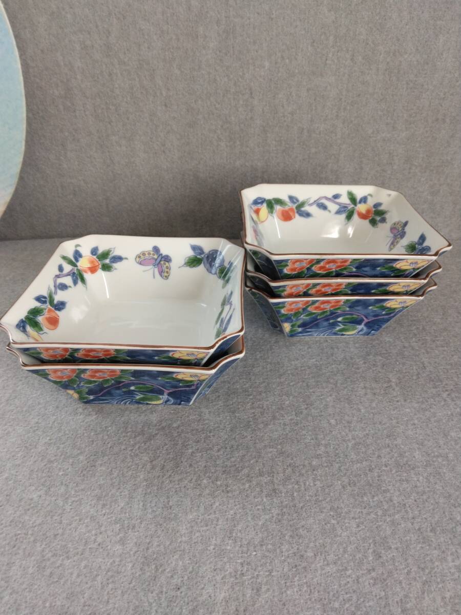 - 和食器 庫山窯 四角鉢 中鉢 色絵鉢 鳥蝶桃 ザクロ吉祥柄 5枚ぐみ