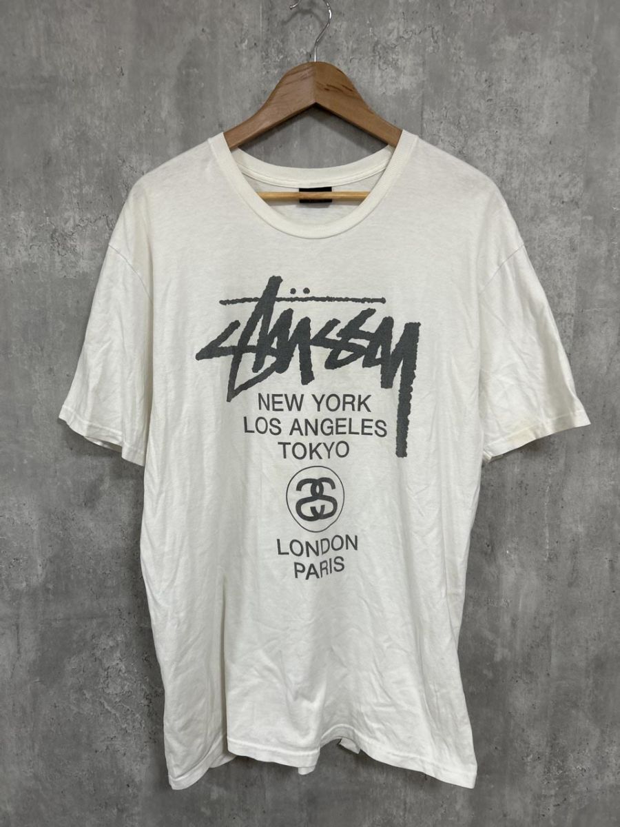 > ネコポスOK STUSSY ステューシー 古着 ワールドツアー 80s オールド ヴィンテージ プリント Tシャツ sizeL/白 ■◆ メンズ