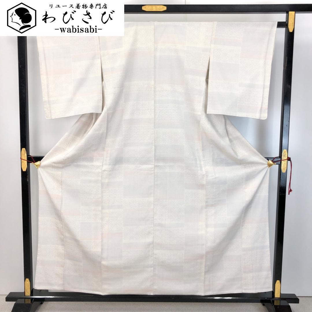> 単衣 塩沢紬 亀甲 四角に麻の葉模様 白練色 K-5256 着物 きもの kimono 和服 和装 中古 リサイクル着物 【送料無料】