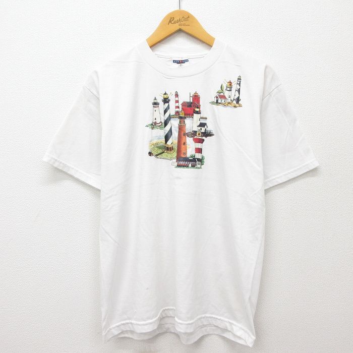 - L/古着 ジャージーズ 半袖 ビンテージ Tシャツ メンズ 00s 灯台 ラインストーン ラメ クルーネック 白 ホワイト 24may21 中