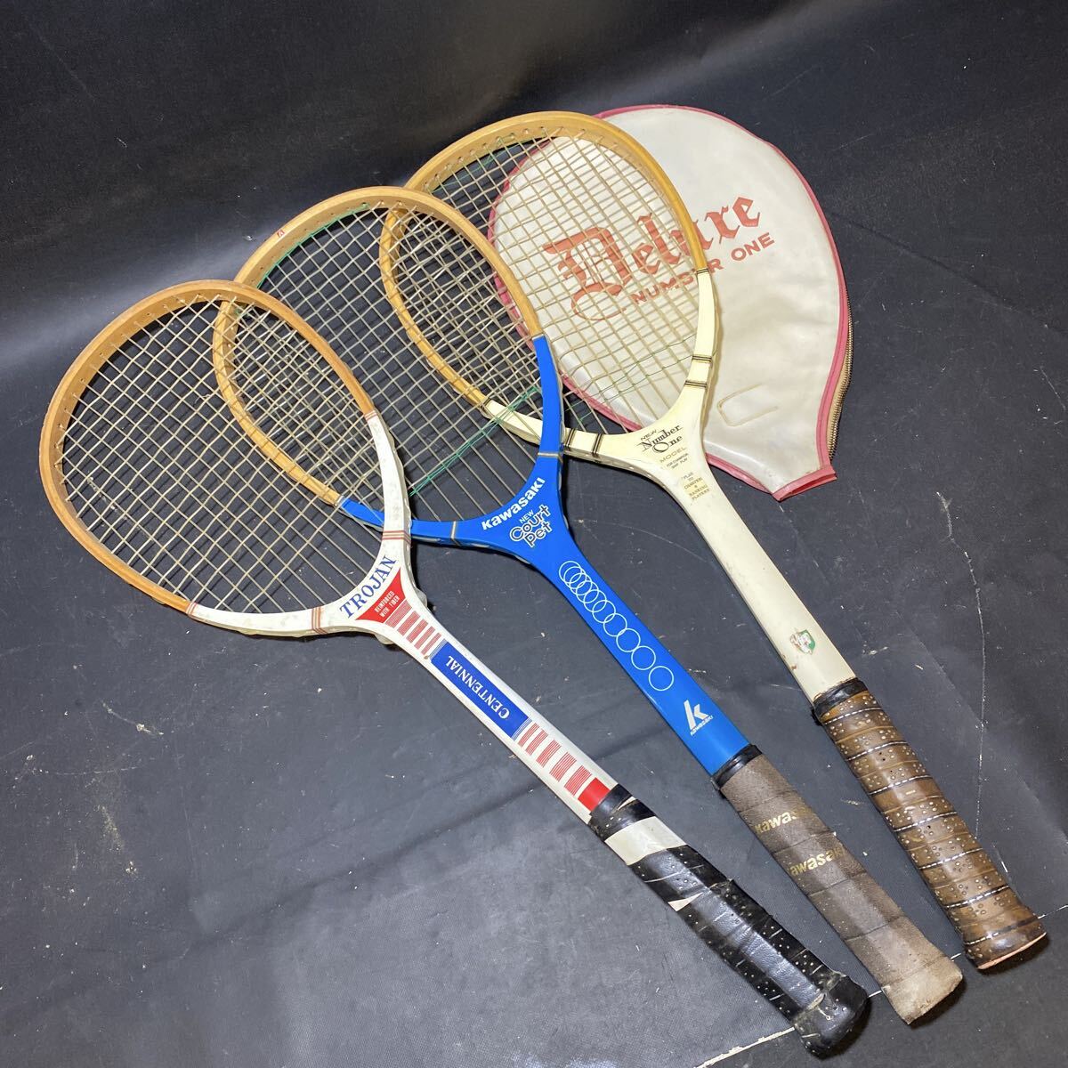 > N 6570 昭和レトロ!![ 木製 テニスラケット 3点セット!] KAWASAKI TROJAN ヴィンテージ 当時物 カバー付 保管品 現状品