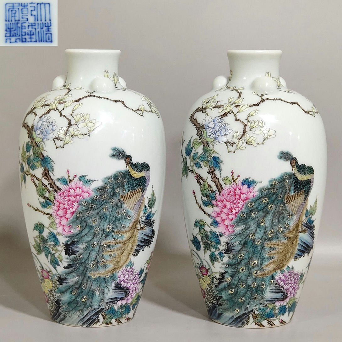 - ▼渡鶴羽▼M2138清時代 乾隆年製 粉彩孔雀開屏題詩梅瓶一対・時代物・古陶磁・古賞物・旧家買出品