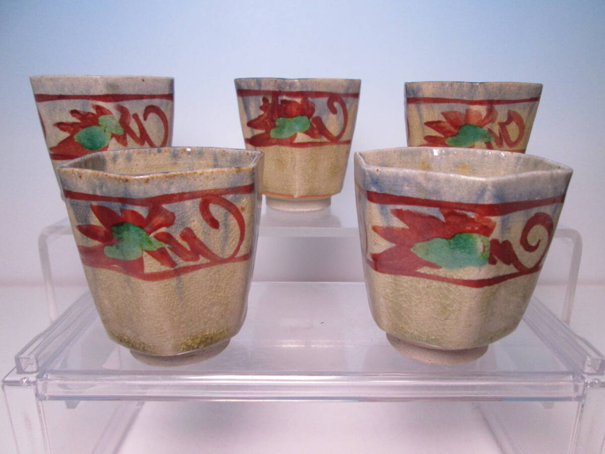 - ☆お料理屋さんの器 飛騨 小糸焼 長倉三朗 色絵 花文 六角 向付 五客 紙箱付 小鉢/懐石/割烹/日本料理