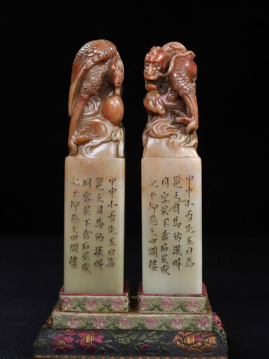 - 永し 清時代 壽山芙蓉石彫 龍鳳呈祥鈕 手彫り 印章 印鑑 印璽 極細工 置物擺件 古美術品 時代物 古董品 収集 旧家蔵出 中国唐物 757g