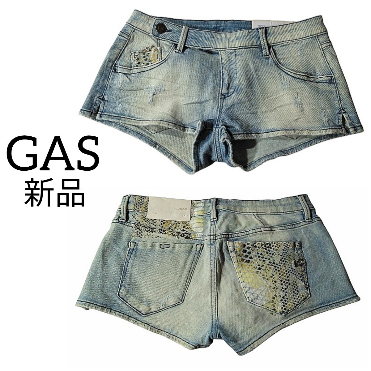 - 78 【新品】 GAS ガス デニム ショートパンツ ミニ マイクロミニ 26 ストレッチ 伸縮性あり ダメージ加工 イタリア製 ギャル 蛇 パイソン