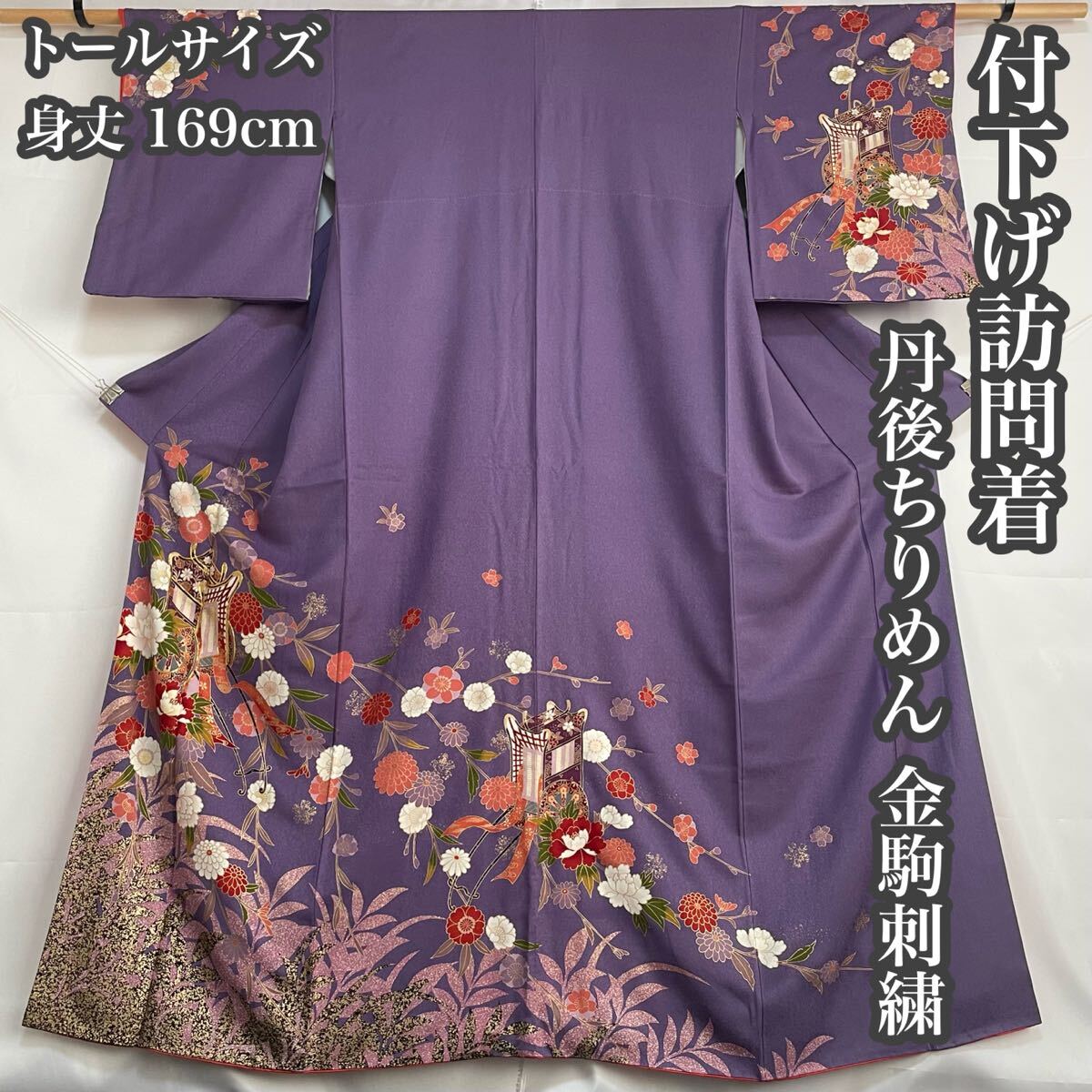 > #G032 トールサイズ 付下げ訪問着 丹後ちりめん 金駒刺繍 金彩加工 手描き 御所車 正絹 スコッチガード加工 身丈169cm 裄68cm【wellriver】