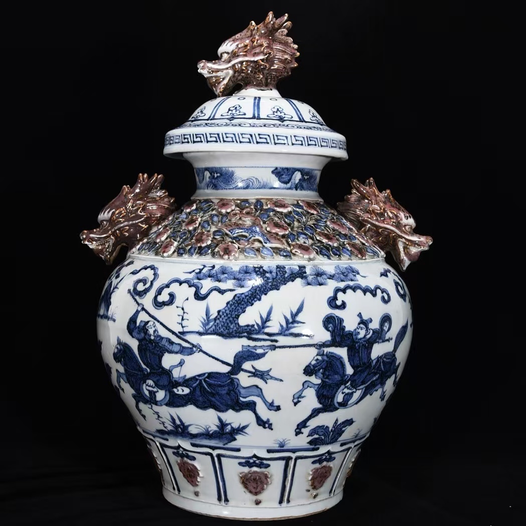 - 秘蔵 元時代 青花釉里紅三英戦呂布絞り花龍頭蓋罐 40cm古陶磁器 陶芸 唐物 古賞物 時代物 骨董品 古置物 極細工 中国磁器 古美味 古玩921