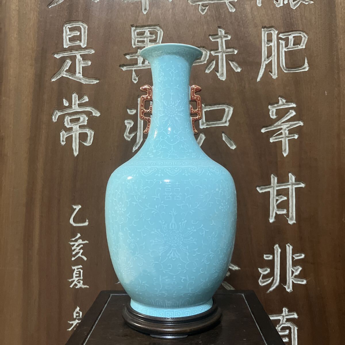 - 【澄今堂】中国美術 唐物 大清道光年製在銘 天藍釉花入 台付 古美術 旧家蔵出 時代物