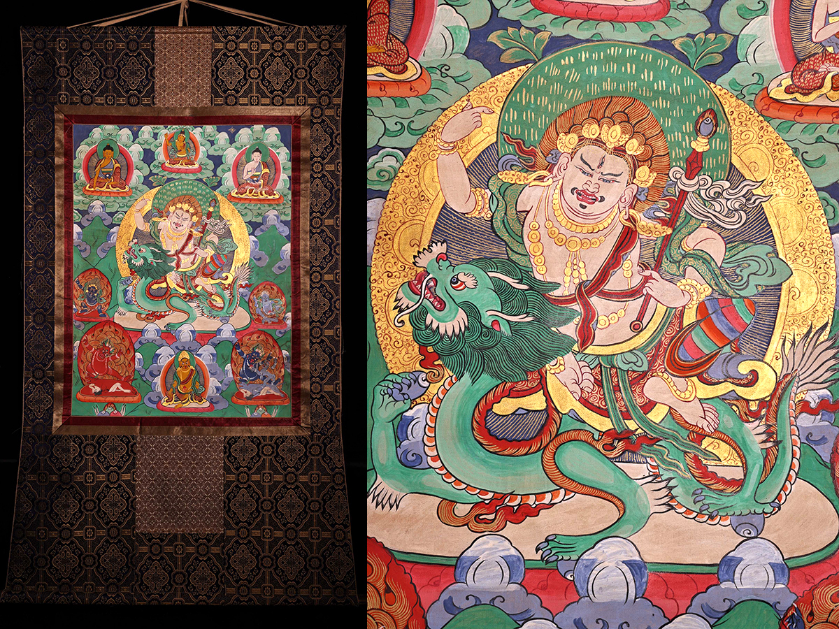 - ▽鴻▽古書道【明代高僧絵師作 龍王財神画像タンカ】 絹布に鉱物顔料 真筆肉筆 紙本 骨董書画 掛け軸 時代物 中国古美術 骨董品