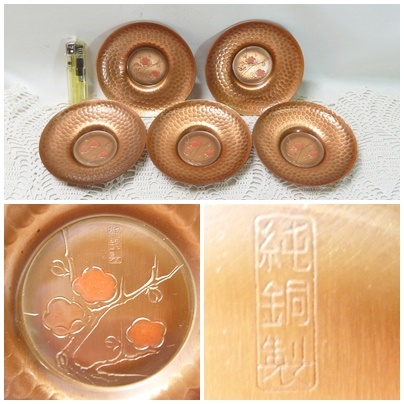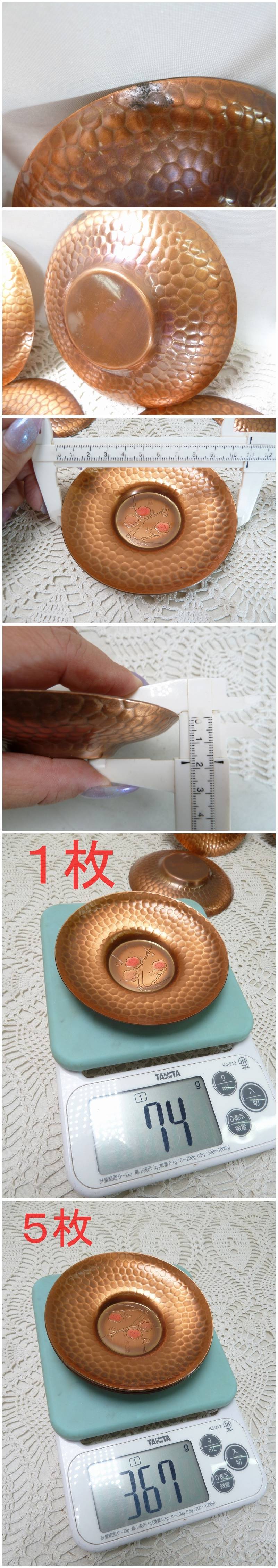 - @純銅製 梅文 茶托揃5枚セット 和食器 銅製 コッパー 工芸品 槌目模様 全体の重さ約367g
