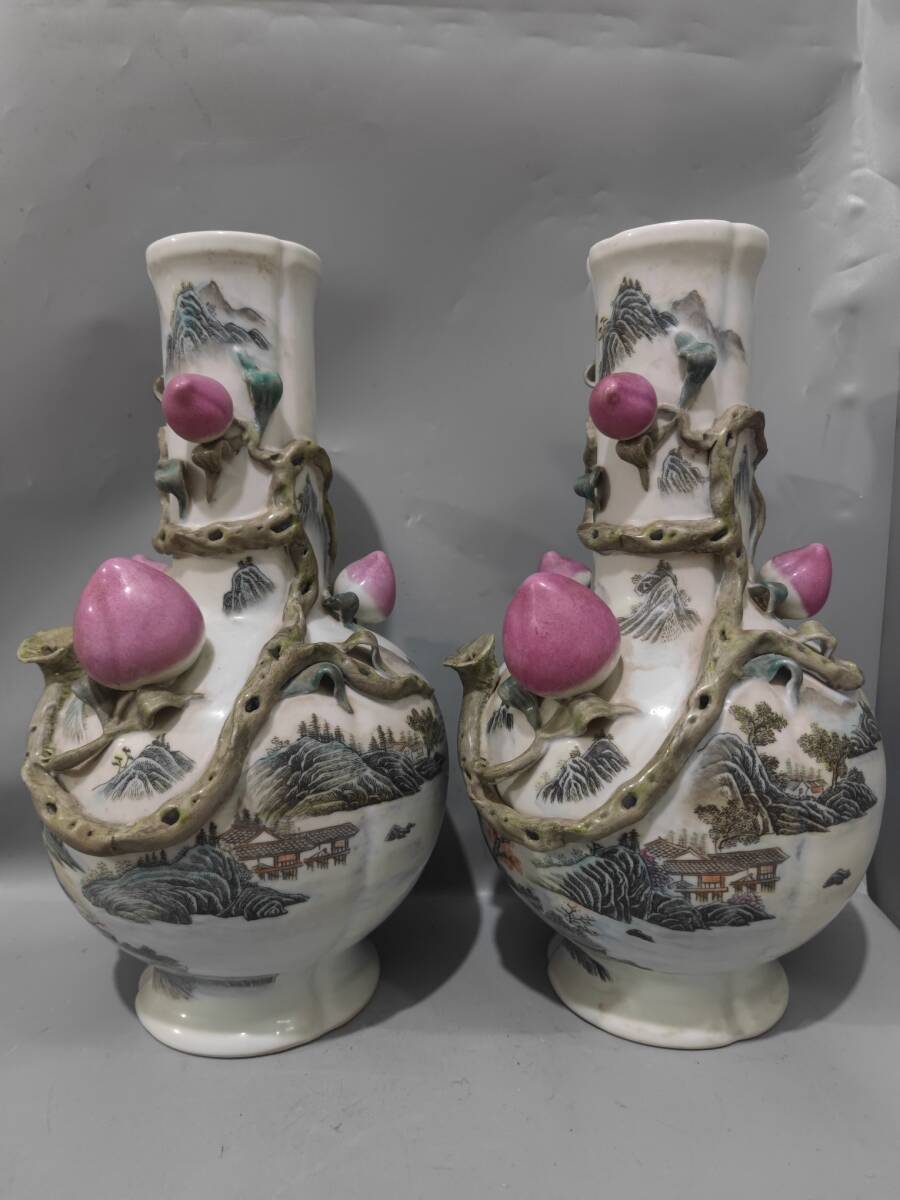 - 9_ZZ9319【惠】人間国宝 中国骨董 陶芸 磁器【清咸豊粉彩堆彫霊芝桃紋山水瓶一対】工芸品 施釉陶 青花磁 陶芸 置物 收藏品