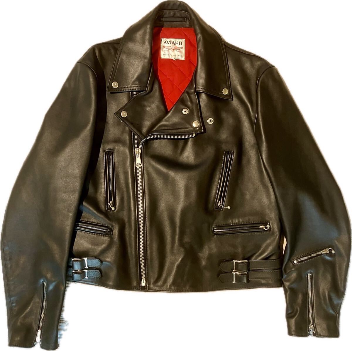 - 美品ルイスレザー44ビッグサイズ大きいサイズ特大サイズライトニング ブラック黒カウハイド牛革ライダースジャケット レザージャケットz685