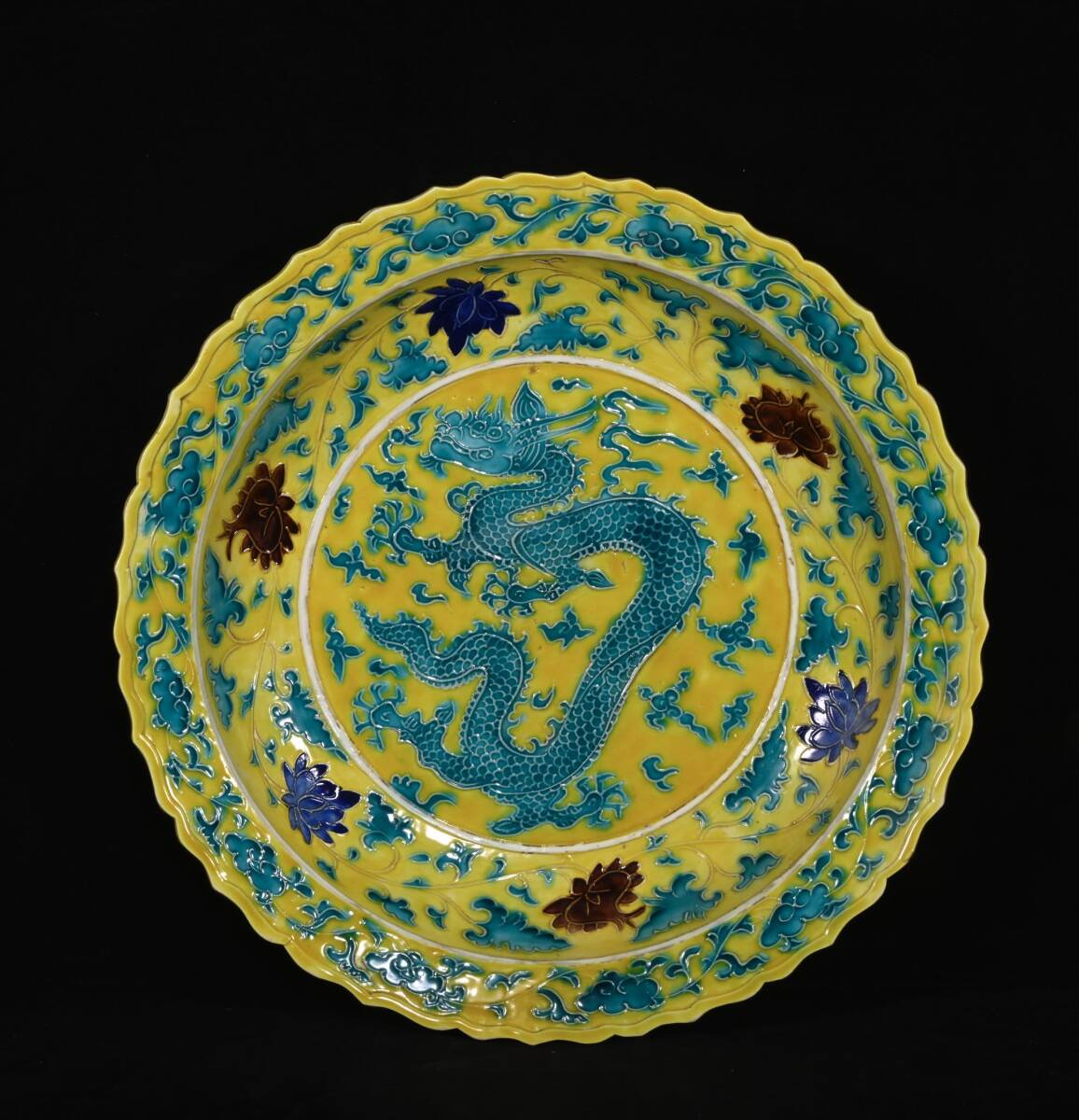 > 9+GV9225「東洋美術」 中国骨董 人間国宝 磁器製品【明永楽の彩龍文折縁皿】 旧物 孤品 珍品 陶磁器 収蔵価値が高い