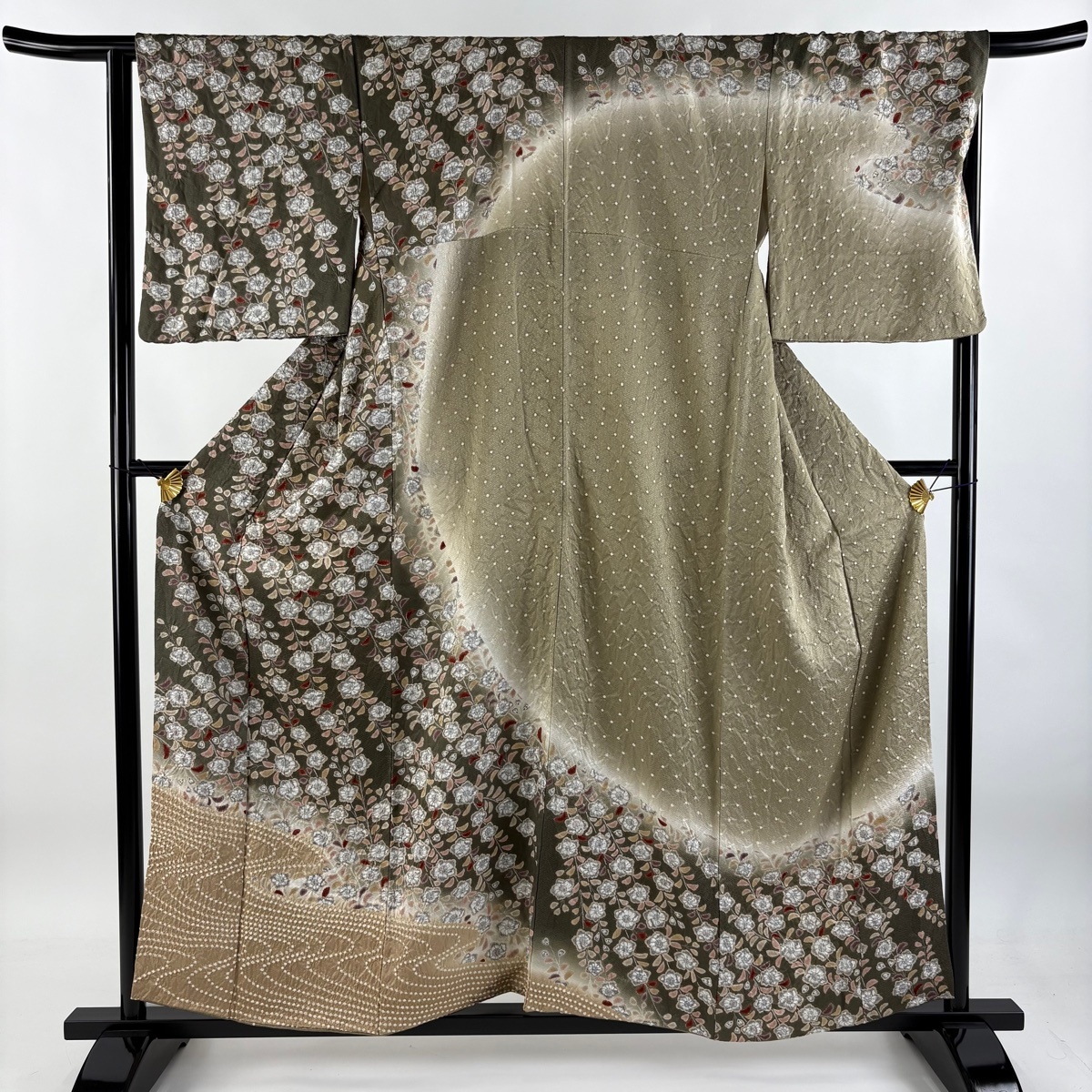 - 訪問着 身丈158cm 裄丈66cm M 袷 草花 流水 絞り 鶯色 正絹 秀品 【中古】
