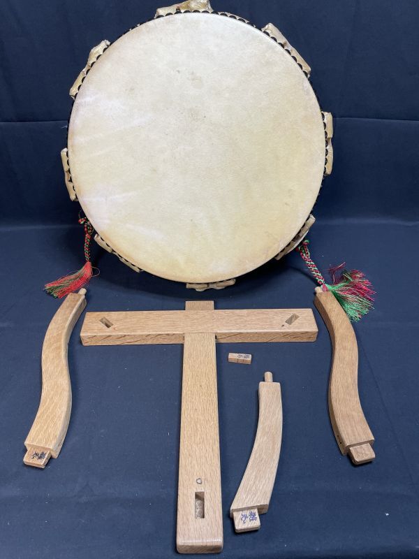 > 【現状品】和太鼓 直径36cm 岡田屋布施 平太鼓 猫足ブショウ台 ケース付属 欅 和楽器 打楽器 伝統 お囃子 お祭り 能楽 歌舞伎 1059005
