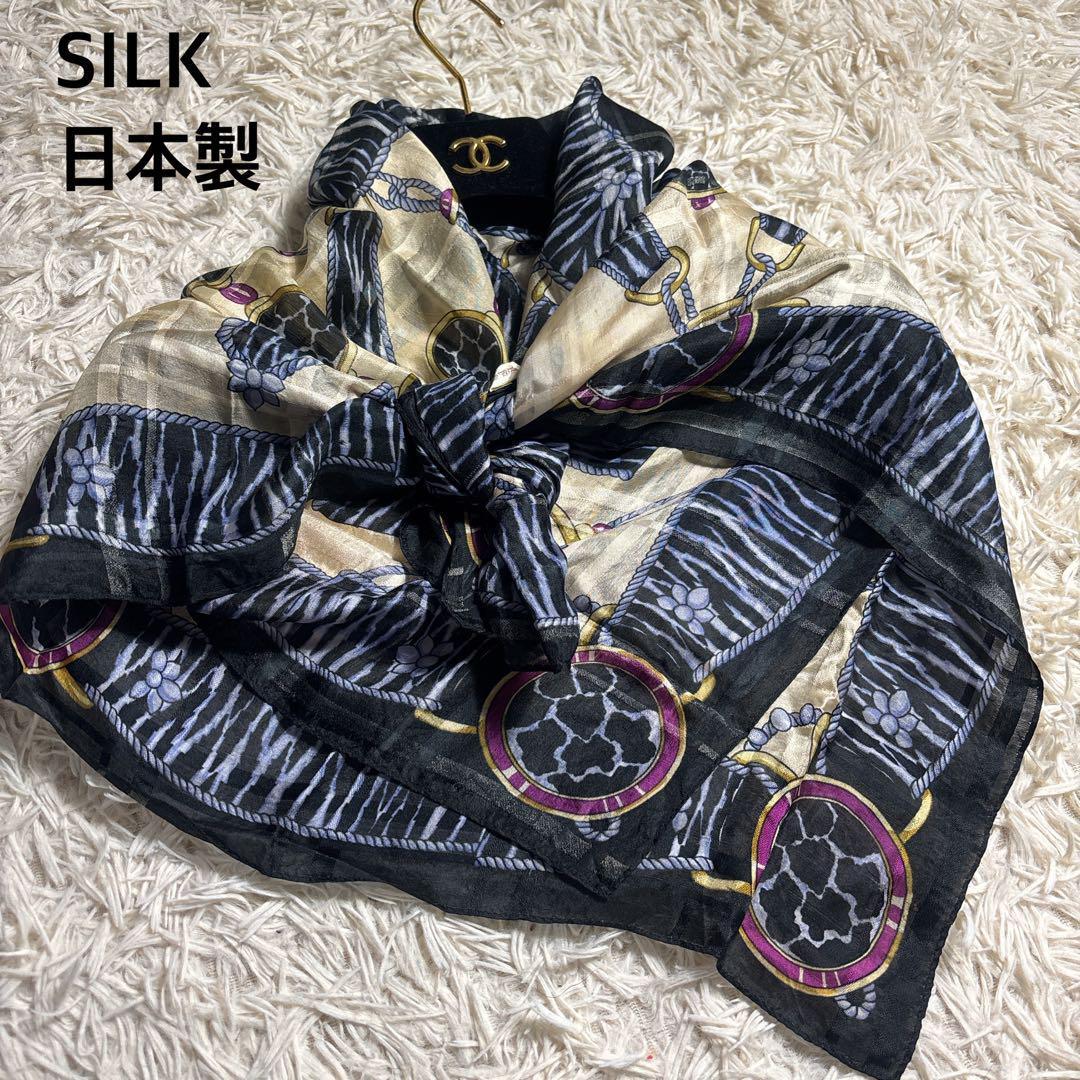 > 美品 シルク100%スカーフ バンダナ ショール 日本製 大判 宝石柄 オフィスカジュアル 高級感 総柄 マルチカラー ヴィンテージ レディース