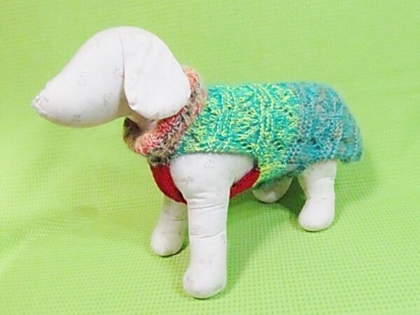 > 新品 手編み 犬服 ペット服 ニット タートルネック 1点もの 小型用 カラフル柄編み DN229 ハンドメイド