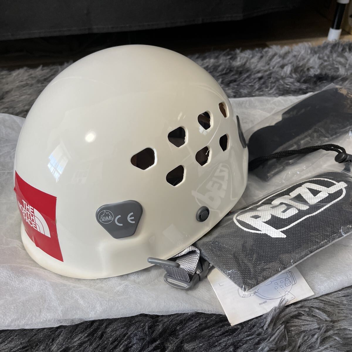 - ペツル●ヘルメット エクランロック●美品 ワンサイズ●カラー ホワイト ノースフェイスのステッカー貼付
