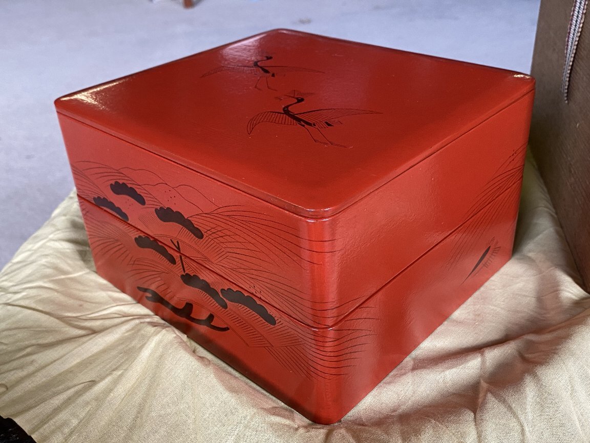 - 一閑塗 漆匠 鈴木表朔 朱一閑塗 蓬莱絵 引重 共箱▼茶道具木製漆器重箱