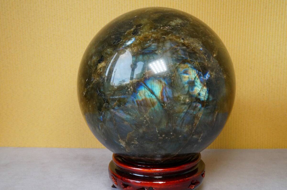 > 特大サイズ【141mm/4Kg】希少!即決価格!天然ラブラドライト 丸玉 極上スフィア ブルー ゴールド シラー 台座付 原石、鑑賞石、鉱物