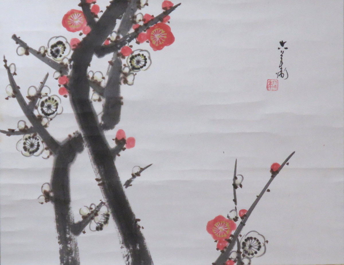 - JY1692◆◇掛軸 清水焼 6代清水六兵衛(1901-1980) 紅白梅 尺五横 物故作家掛軸◇◆早春 春 普段掛け めでた掛け 開運