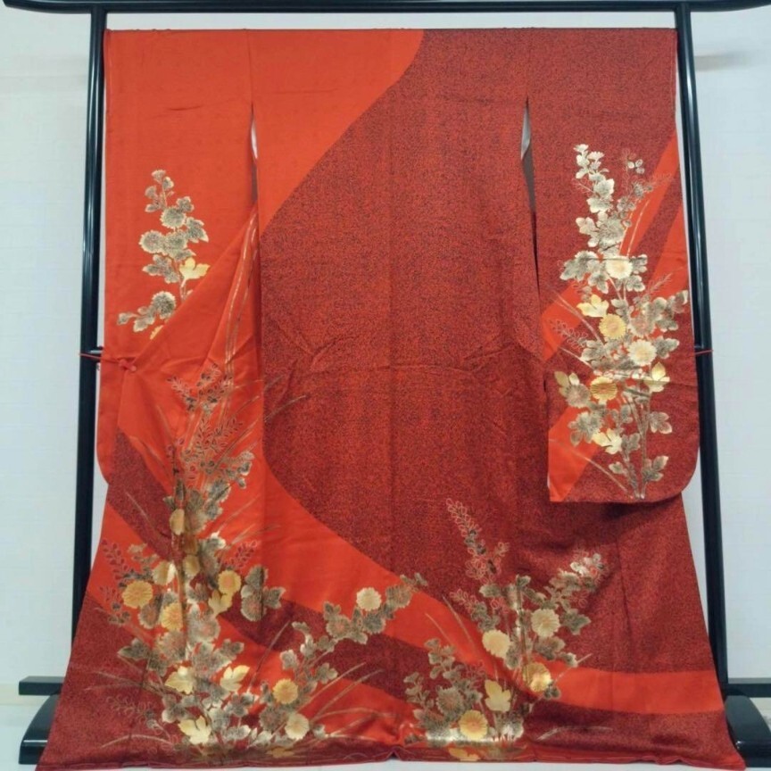 - 【楓】振袖 正絹 金箔 金彩 辻が花 たたき染め 籠目 広衿 袷 着物 KU-227