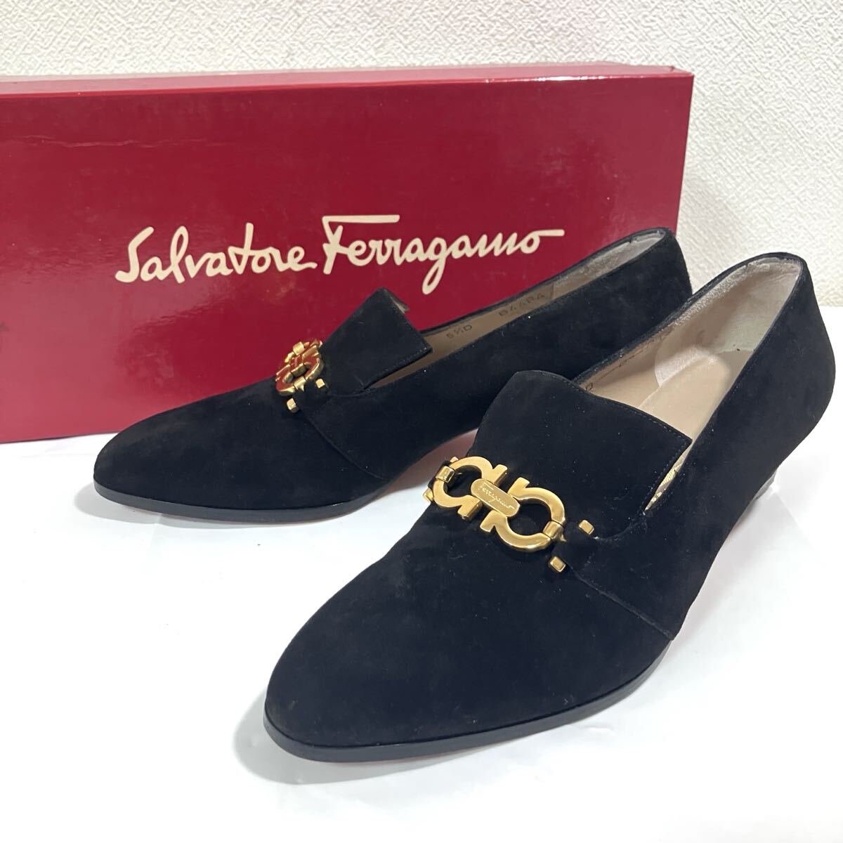 - Salvatore Ferragamo サルヴァトーレフェラガモ RINATA ガンチーニ スエード ヒールローファー パンプス ブラック 黒 5 1/2 D 箱付