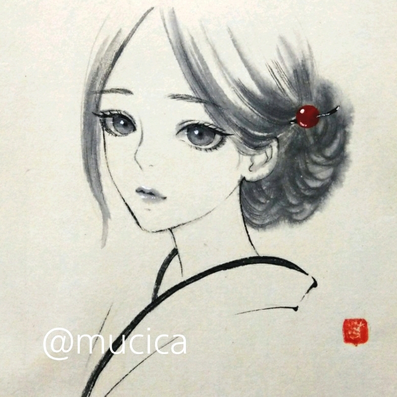 - 肉筆原画 墨絵 絵画 美人画 かんざし 和服 和装 日本画 水墨画 F1弱 手描きイラスト 和服 着物
