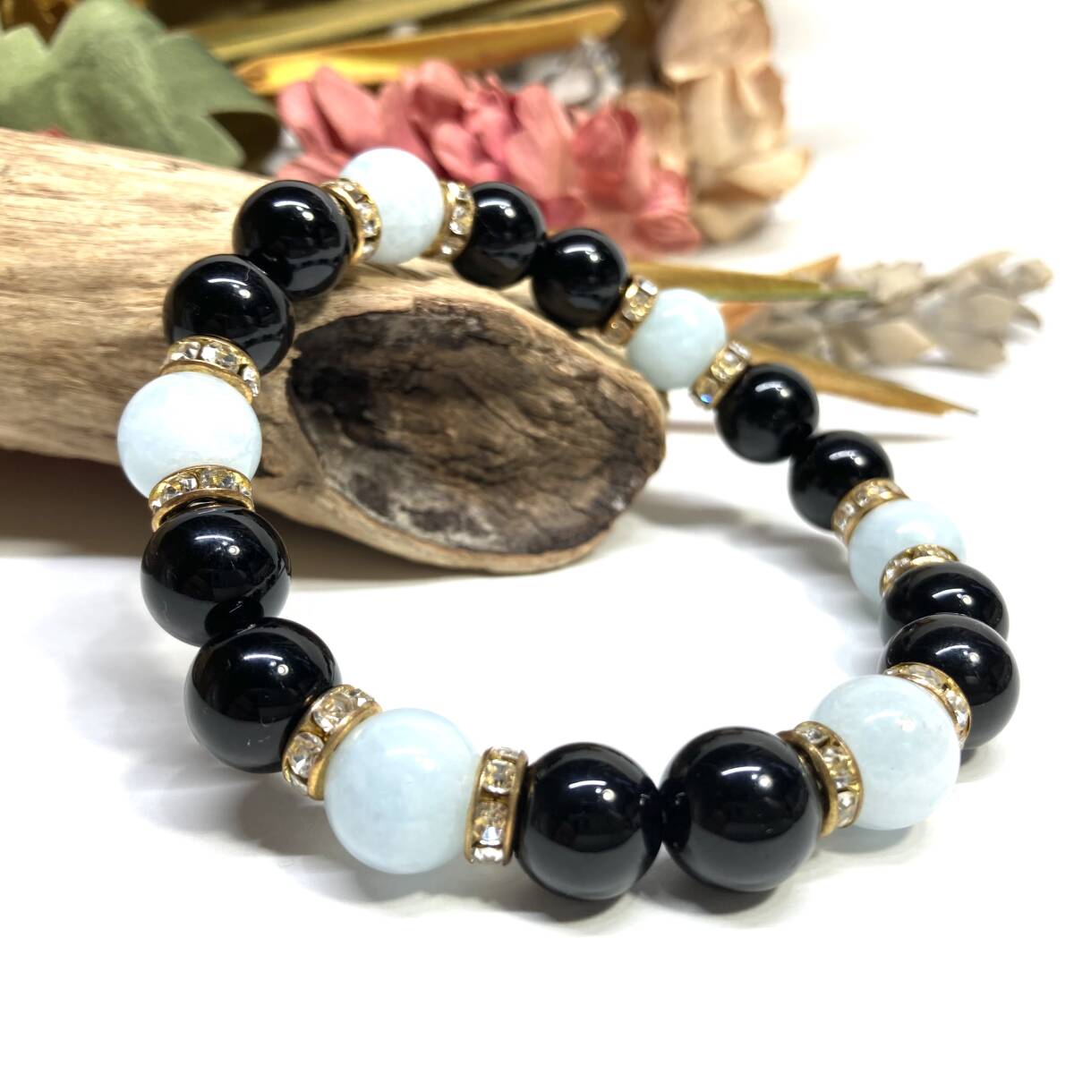 > モリオン&アクアマリンパワーストーン ブレスレット 天然石ブレス (ゴールド) 10mm メンズ・レディース 厄除け 魔除け ☆