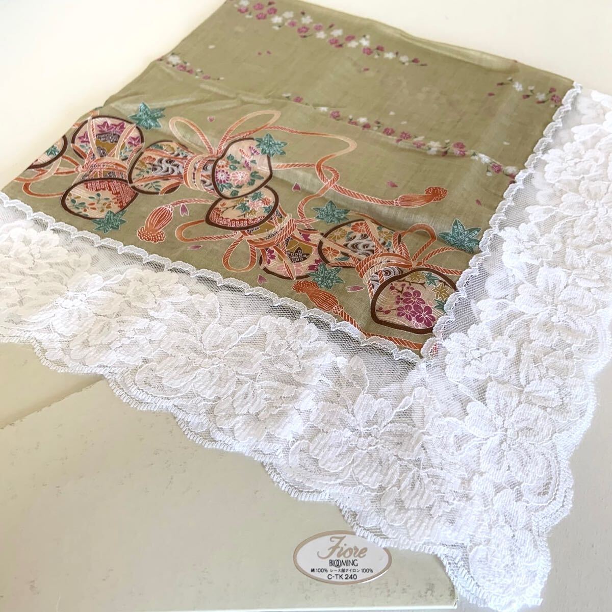> 未使用 Fiore フィオーレ レース 大判ハンカチ 約56×57cm 総柄 綿100% ナイロン100% レディース ひざ掛け にも 保管品 【ケース無し】