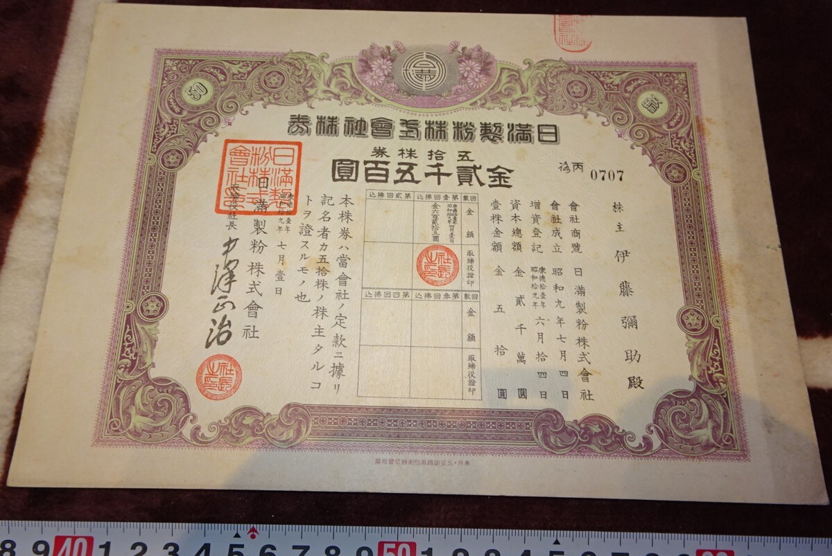 > rarebookkyoto m245 満洲 帝国 日満製粉株式会社 弐千五百圓株券 1945 年 五庄堂証券印刷 新京 満鉄 大連
