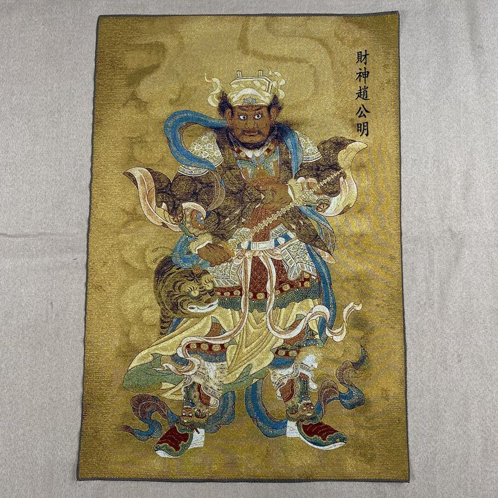 - 中国 唐 錦画 金糸刺繍 宗教仏像 財神 趙公明 錦絵 織物 風水 招財 美術 装飾画 コレクション sux184