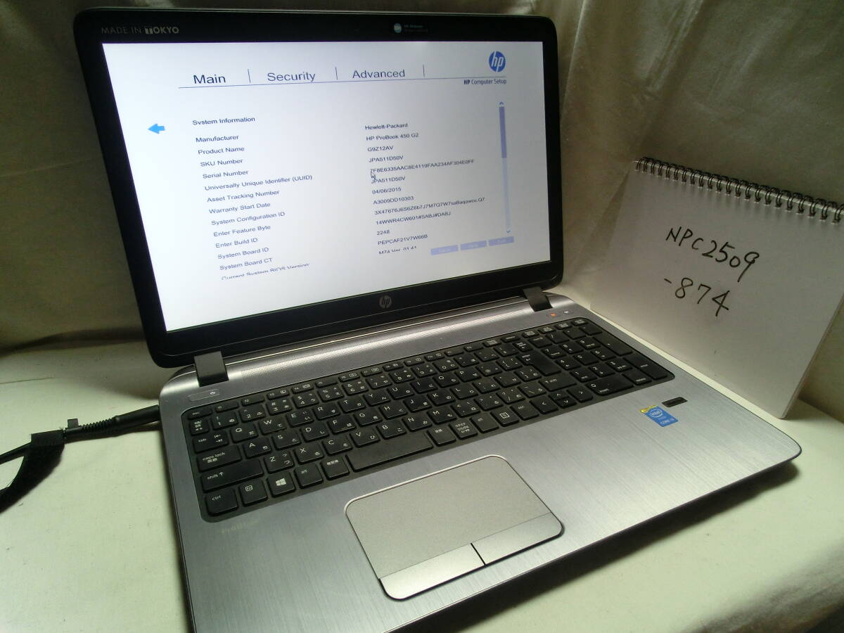 - 【ジャンク扱い】HP Probook 450 G2(動作確認済)/Intel Core i3-4030U/メモリ8GB/ストレージ無/管:NPC2509-874
