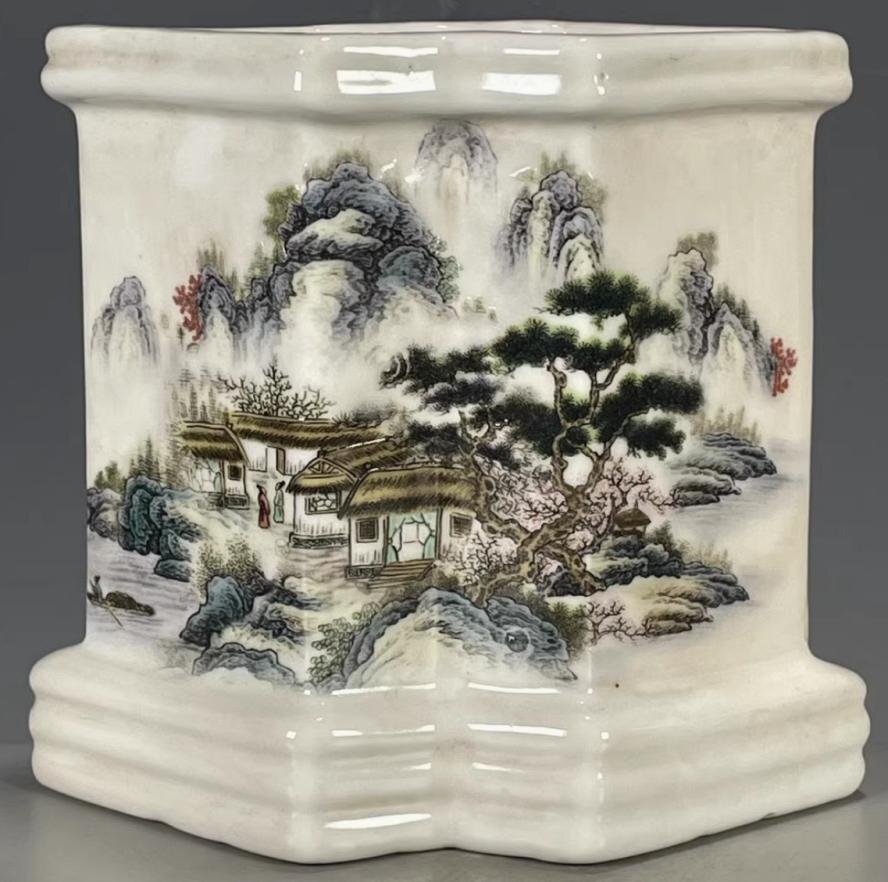 - 磁器 玉底 粉彩 山水紋 多角ペン立て 筆立 置物 磁器 中国陶磁 中国美術