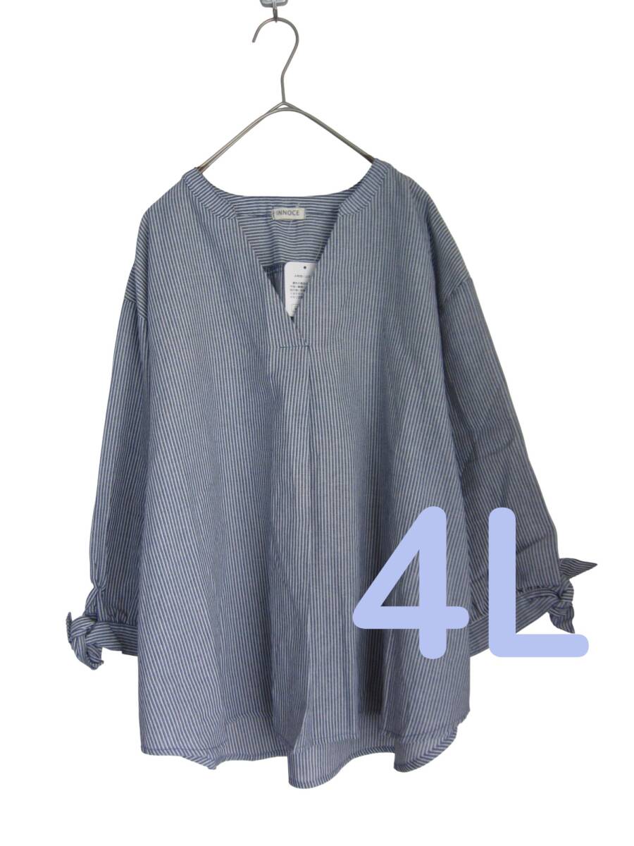 - ★送料無料 W93 新品 【4L】 ネイビー ストライプ 7分袖 シャツチュニック 袖リボン 大きいサイズ ゆうパケットポスト