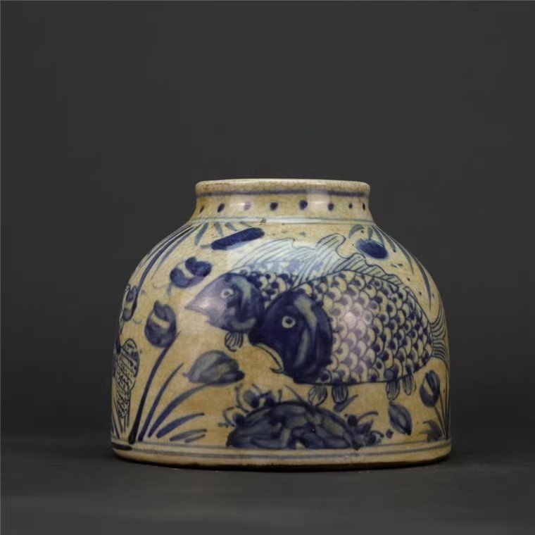 - 送料無料 景徳鎮 馬蹄缶 缶 青花 魚柄 手描き 磁器 陶磁器 観賞 置物 中国美術品 工芸品 zh93