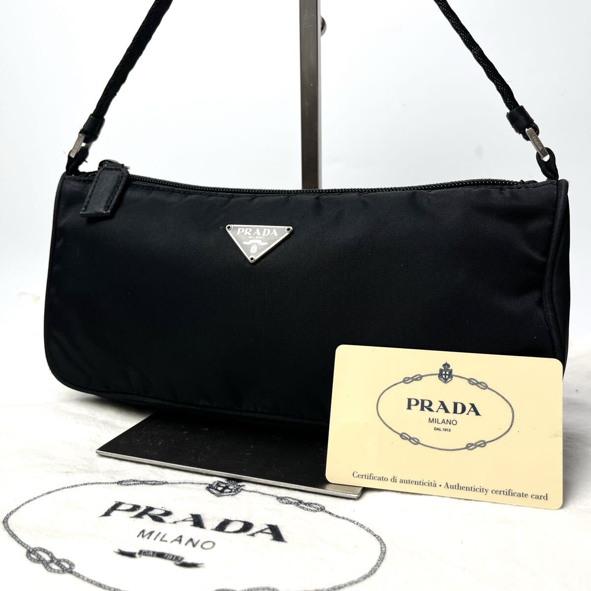 > ●極美品 PRADA プラダ アクセサリーポーチ 三角ロゴプレート ワンハンドル ハンドバッグ テスートナイロン ブラック 黒 ポコノ NERO