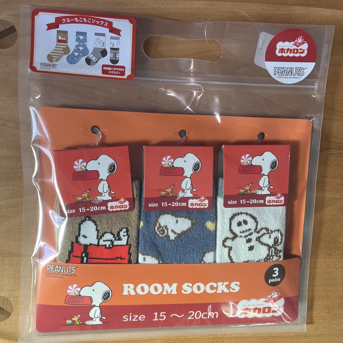 - PEANUTSキャラクターのデザインが施された15~20cmのルームソックス3足セット。
