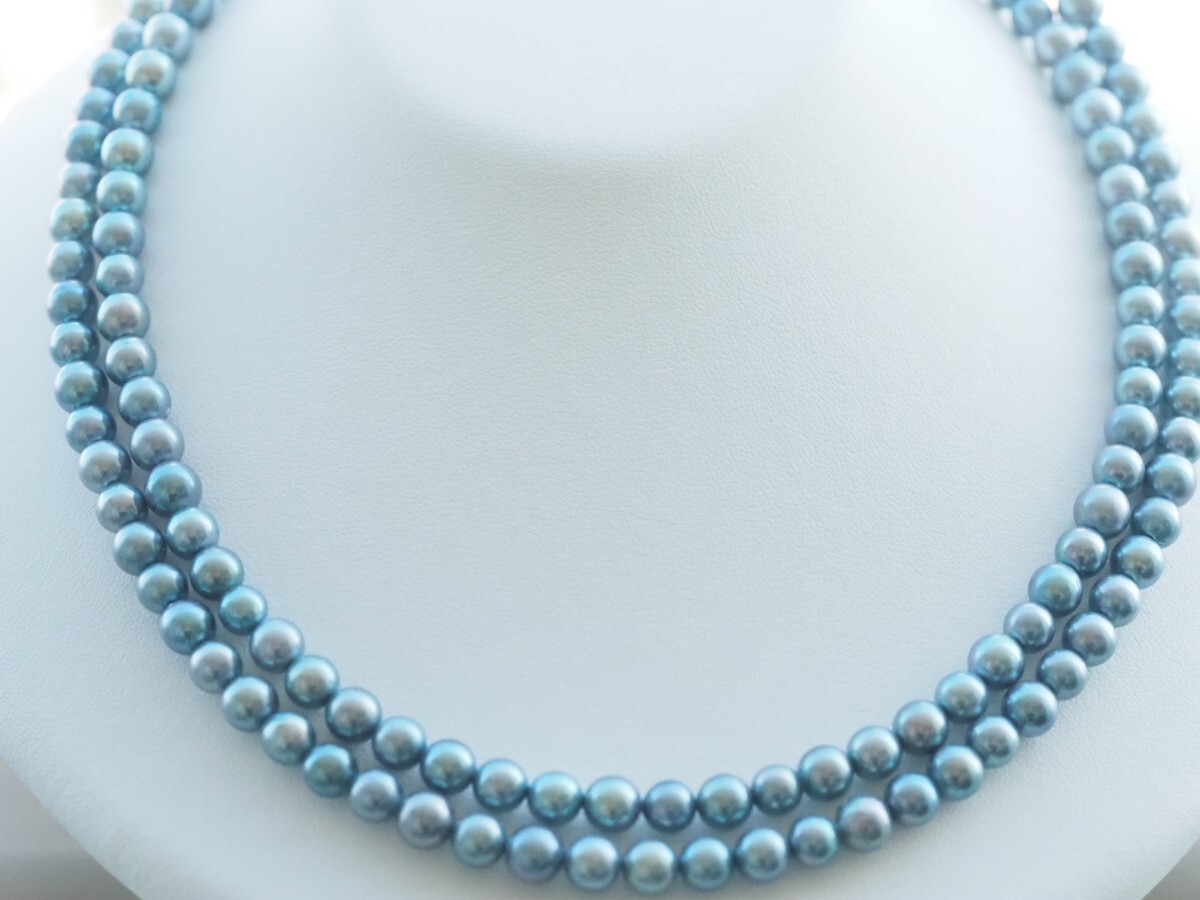 > 素敵なブルーカラー天然アコヤ本真珠ロングネックレス パール6.0mm~7.0mm珠 90cm シルバークラスプ 新品 未使用
