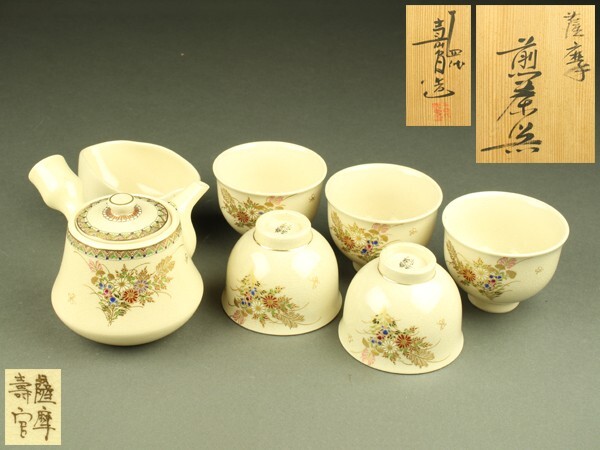 - 【宇】2487 十四代 沈寿官造 薩摩煎茶器 急須 湯冷まし 煎茶碗 共箱 煎茶道具