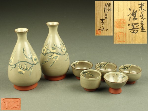 - 【宇】2190 無明異焼 五代 伊藤赤水造 梅文酒器 徳利 猪口 共箱