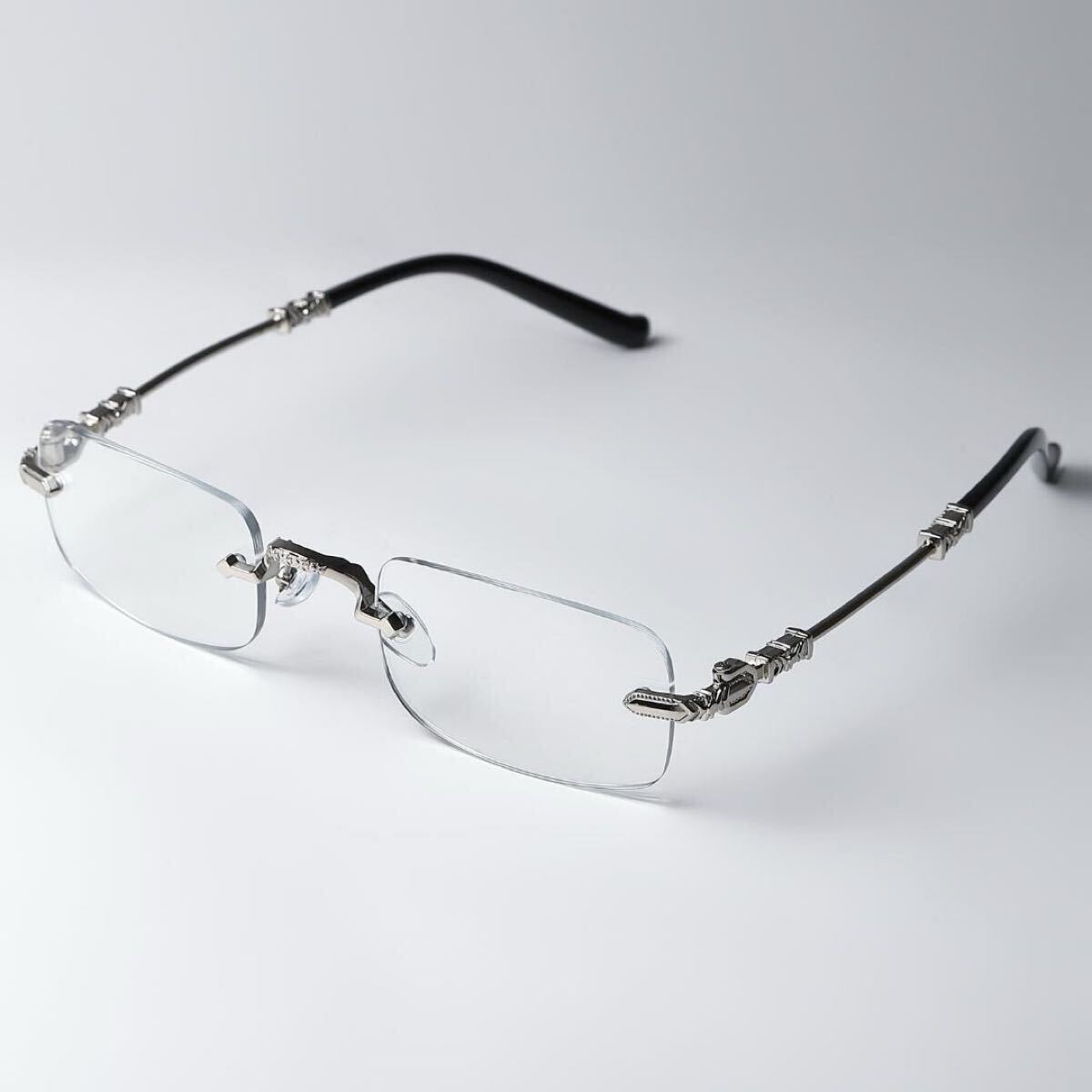 - 伊達メガネ シルバー 銀装飾 メタル リムレス 縁なし メンズレディース 高級感 ブルーライトカット 彫金調 クラシック レトロ ストリート